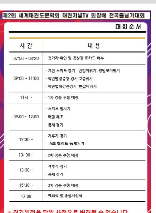 참가 선수 분들께서는 8시20분까지 체육관에 입장해 주시고 세부일정은 밑에 일정표 확인부탁드립니다.